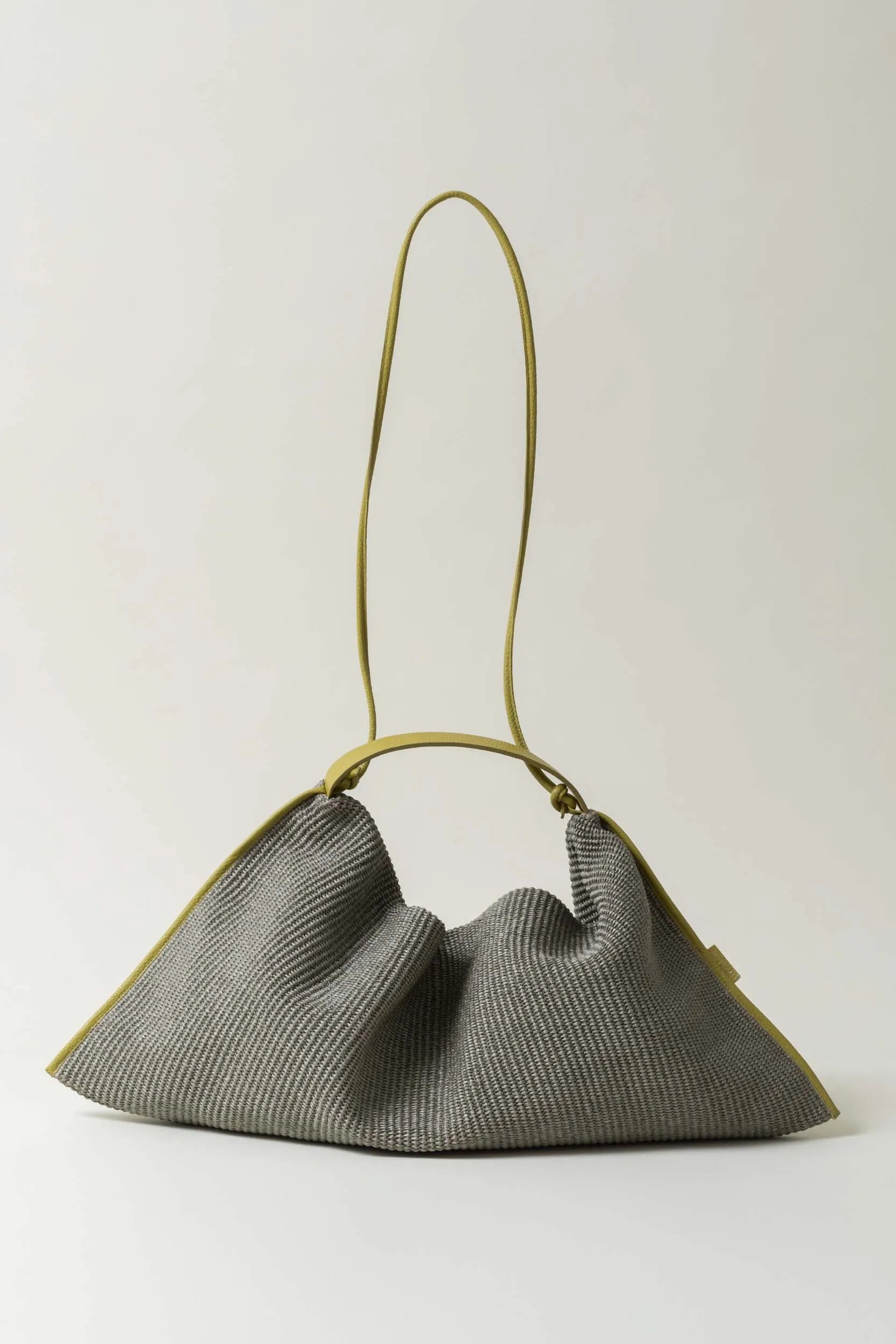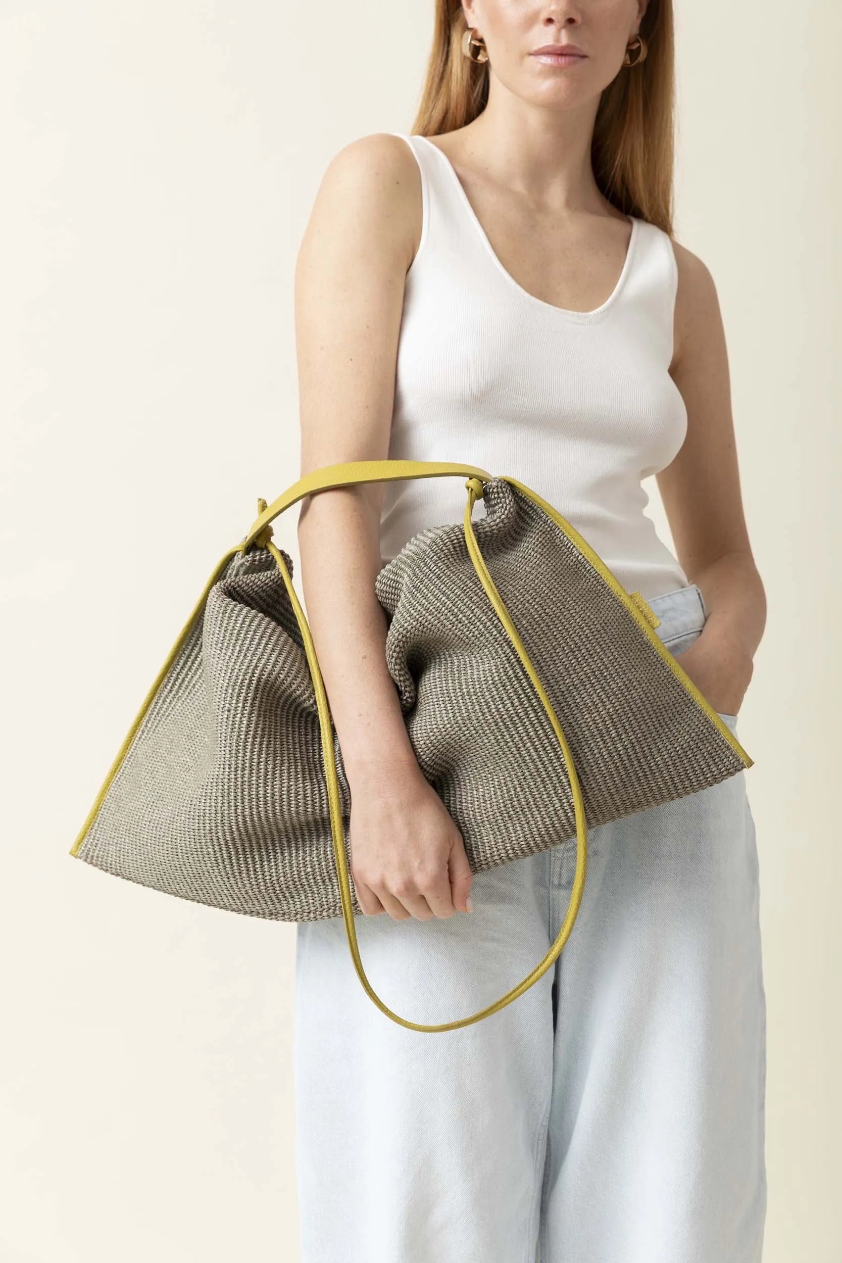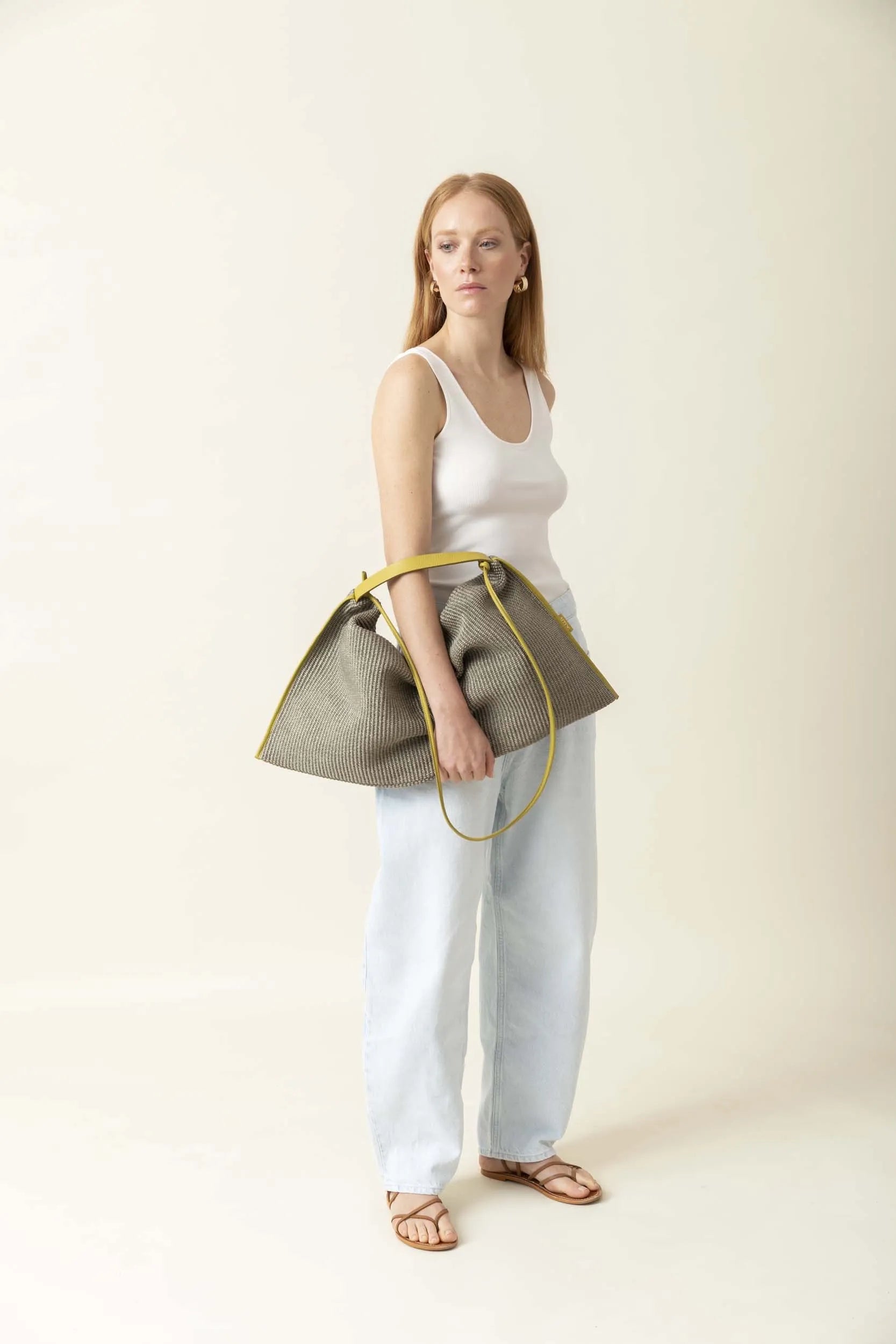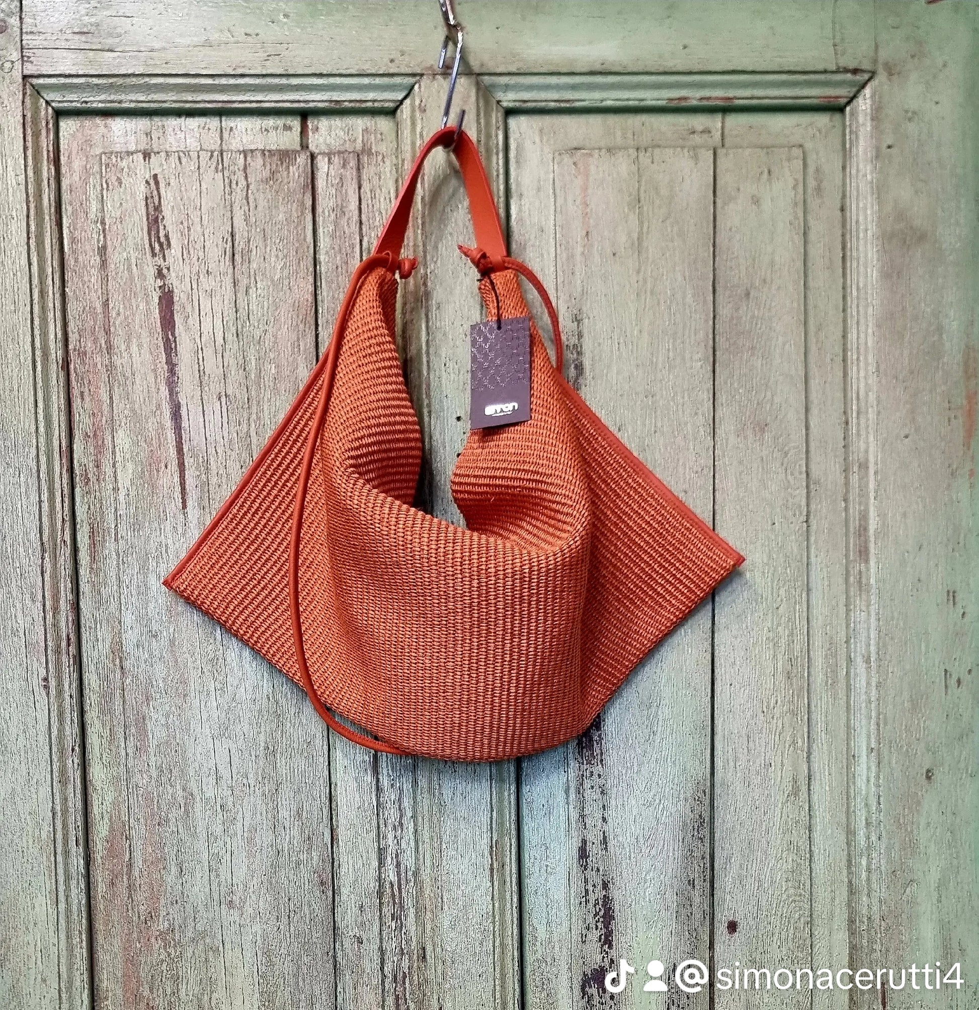 Borsa hobo in rafia con manico e bordo in pelle, da portare sia a spalla che a tracolla. Ha una forma unica che non passa inosservata, è allo stesso tempo comodissima e avvolgente.