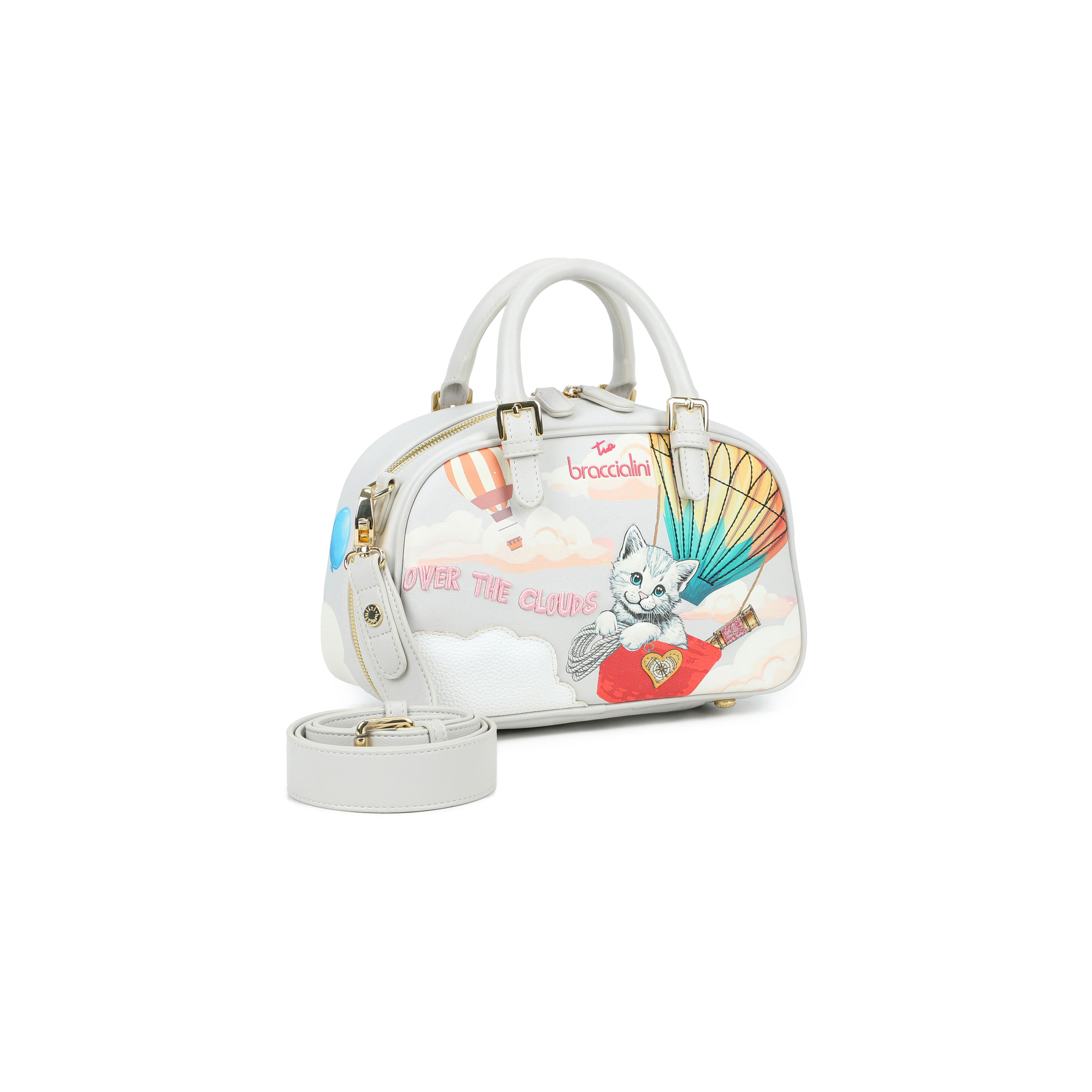 Bauletto compatto in similpelle con doppio manico rigido, impreziosito da una stampa fiabesca con un dolce gattino in mongolfiera e dettagli ricamati multicolore. Il design "Over the Clouds" dona un tocco sognante e spensierato, mentre le applicazioni glitterate e i dettagli dorati conferiscono un look brillante e originale. Completo di tracolla regolabile e removibile, è perfetto per chi desidera versatilità senza rinunciare allo stile.