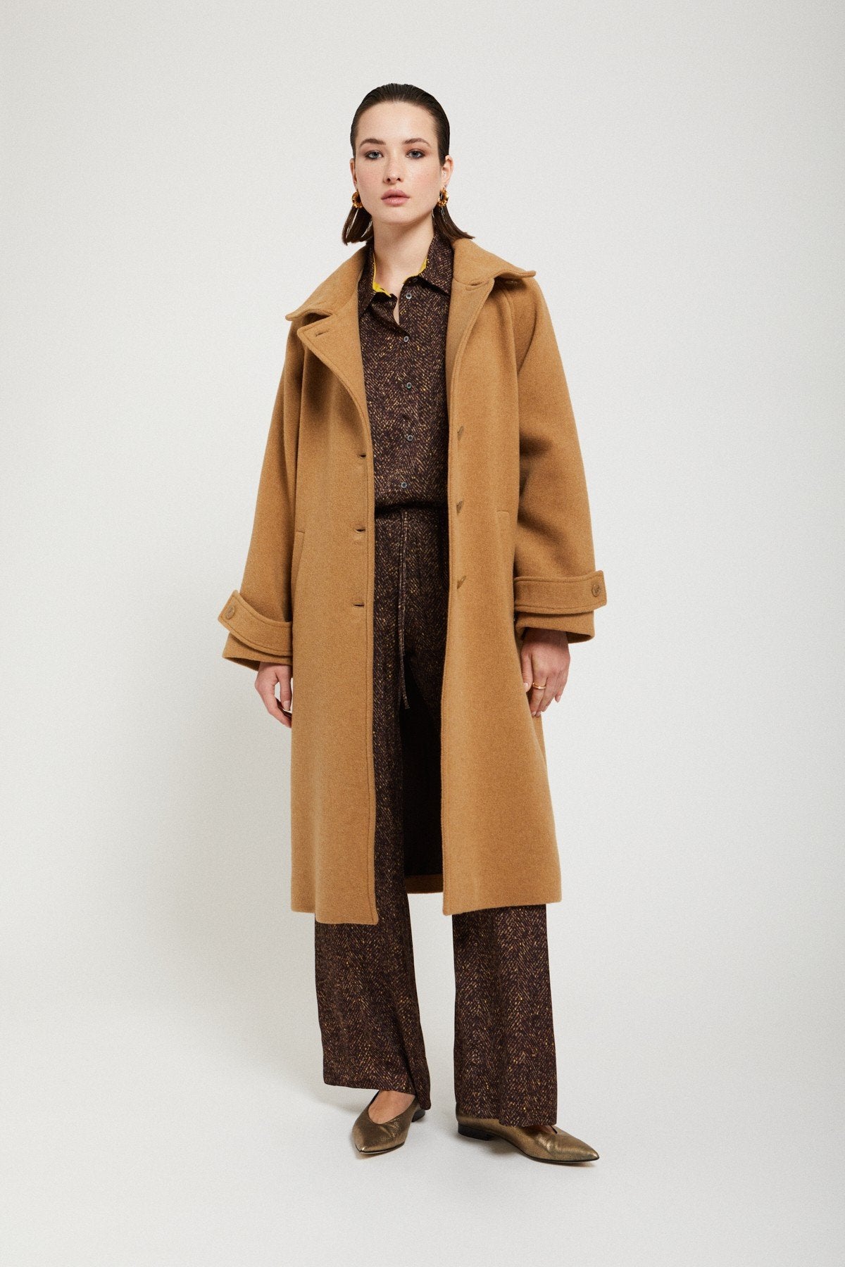 Cappotto midi 3 bottoni in misto lana con cintura in tinta. Colore CAMEL